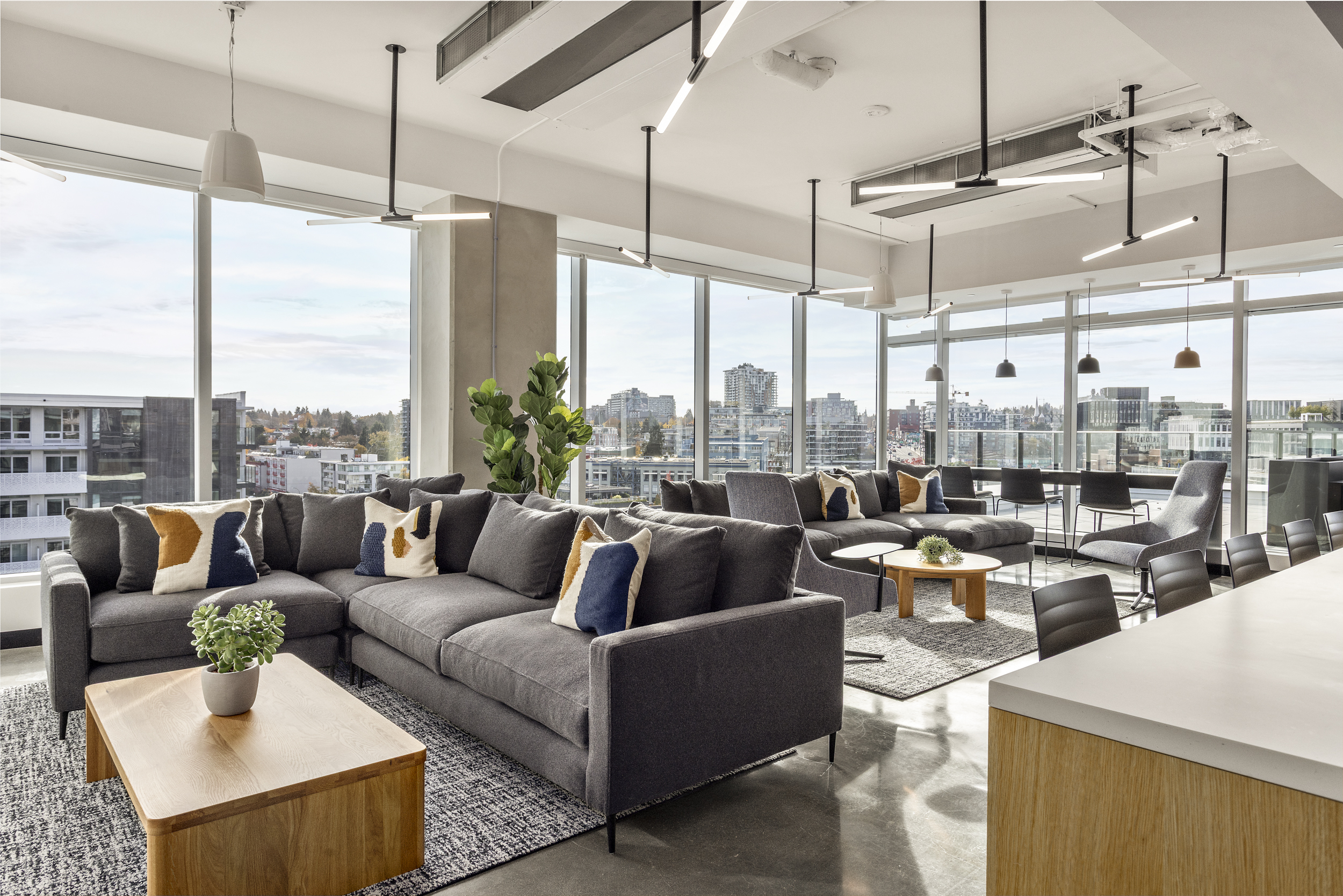 The indoor common area lounge features soft seating, perfect for impromptu meetings, brainstorming and informal workspaces for varying work styles while enjoying the unparalleled mountain views as your backdrop.